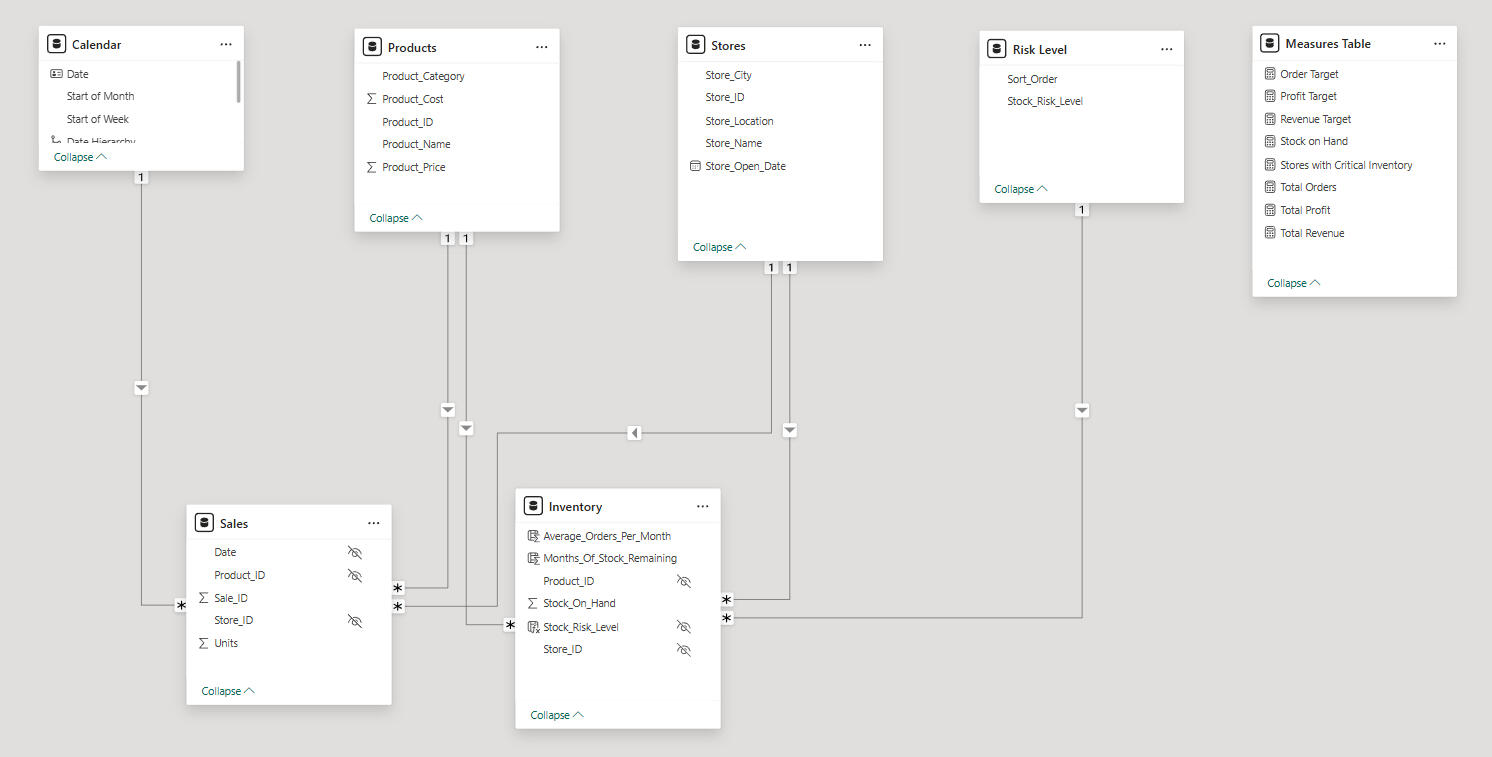 Star schema with two fact tables (Sales and Inventory) connected to four dimension tables: Calendar, Products, Stores, and Risk Level. A dedicated Measures Table keeps DAX measures organized and separate from source data tables. The Inventory table includes calculated columns for Average Orders Per Month, Months of Stock Remaining, and Stock Risk Level — the logic behind the inventory risk page.