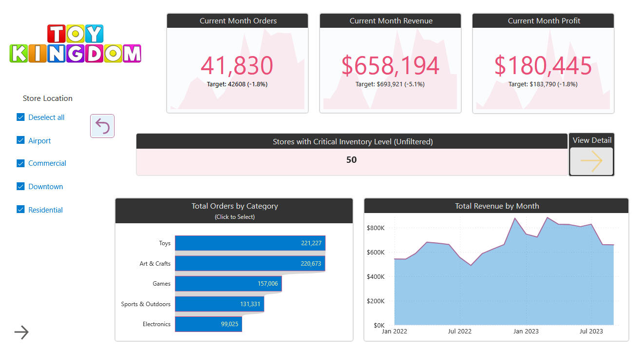 This dashboard monitors store-level sales performance against monthly targets and flags inventory risk across product categories and locations. Built in Power BI using the Maven Analytics Toy Store dataset.